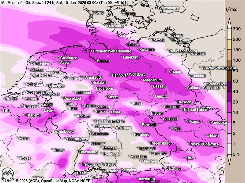Die aktuellen Wettermodelle (GFS) zeigen für Freitag eine winterliche Zuspitzung durch Tief „Elli“. Besonders das östliche und nördliche Niedersachsen steht im Fokus: Dort werden 10 bis 20 Zentimeter Neuschnee sowie starke Schneeverwehungen erwartet.