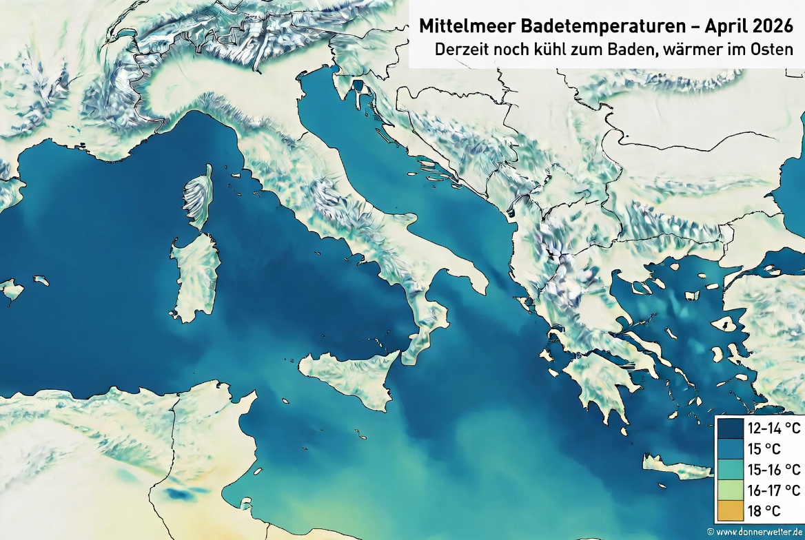 Aktuelle Wassertemperaturen (ca. 8.–9. April 2026)Die Oberflächentemperaturen liegen derzeit meist zwischen 13 °C und 18 °C. Zum Baden ist es noch recht frisch – echte Badetemperaturen (ab ca. 20–21 °C) gibt es nur vereinzelt im äußersten Osten.