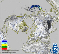Schaut man sich nun den Globus vom Weltall über dem Nordpol aus betrachtet an, wird deutlich, welch weiten Weg über Nordamerika bis Europa diese Luftmasse noch nehmen musste. Auf diesem Weg wird die Luft natürlich weiter durchmischt und verwirbelt. Hinzu kommt auch noch, dass zwischenzeitlich radioaktive Teilchen durch Regen aus der Luft ausgewaschen werden.