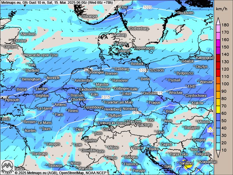 Nachfolgend die GFS-Wetterkarte sowie die Windprognose für den kommenden Samstag, 15.03.2025: